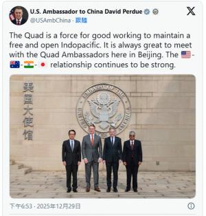 据美国驻中国大使庞德伟在X平台发布,在共军环台军演之际,“四方安全对话”包括美国、日本、印度、澳洲的大使12月30日在北京会面。庞德伟表示,“四方安全对话”是维护自由开放的印太地区的力量,四国关系持续稳固强劲。 香港南华早报12月31日报道,“四方安全对话”(Quad)的各国大使在北京会面并非新事,2024年中时任美国驻华大使伯恩斯(Nicholas Burns)曾在北京与“四方安全对话”各