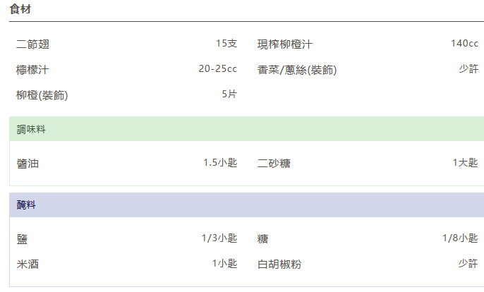 將雞翅洗淨以紙巾擦乾水份;柳橙汁、檸檬汁和糖混合拌勻;青蔥切蔥絲備用。