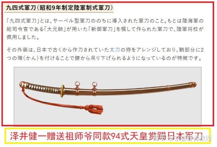 这件文物现在去向不明,估计已经被化成了钢水了吧?我在日本一家古董店网站上找到了同款的94式军刀,见下图: