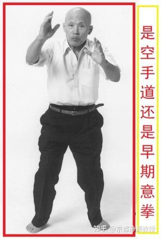 如今,或许我们可以通过对日本意拳的了解,加深对上个世纪三、四十年代中国意拳的了解。日本意拳已经成了研究中国早期意拳具体技术的活化石。看看下面泽井健一的这个动作,你说这是来自日本空手道呢,还是来自上个世纪三、四十年代的早期中国意拳呢?他是站桩的一种桩法呢,还是他正要做平推试力的瞬间留影呢?实话说,我没有答案。我看过泽井健一从1950-1980整整三十年间的几乎全部教学视频,竟然没有答案!