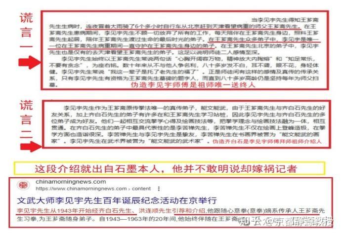 在这个撒谎成性的个人网站上,他精心杜撰了以下两大谎言,以此想来证明他自己在本门派(没有正式拜过师)的“合法合规”身份。这两大谎言第一是伪造李见宇师傅是祖师爷唯一的送终人!第二是伪造李见宇师傅拜师祖师爷是齐白石的介绍。证据见如下截图: