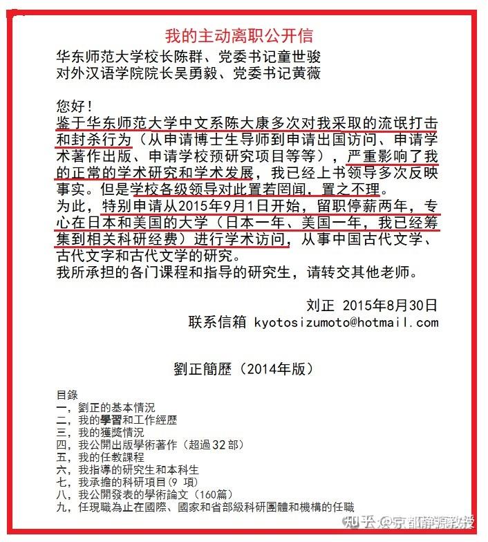 文件一:2015年8月30日,刘正自动离职赴美、日两国从事科研活动告知信。