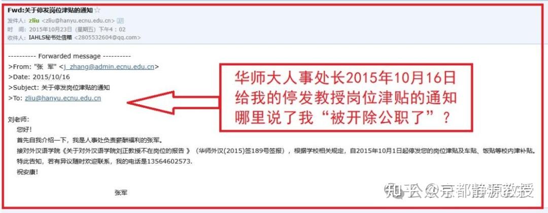 文件二:2015年10月16日,华师大人事处长给我的教授津贴停发通知。