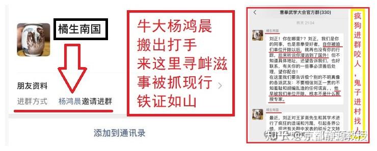 这一次,他又主动出手,搬来几个打手下场。一个化名“橘生南国”的“畜类”,带着一个自称是“沪上不老翁”和三个自称“意拳大成拳第四代爱好者”的“四位刺客”,匆匆上场了。我善意地以为最近神意拳大忽悠石墨该反思该收敛了,结果人家动用手下去万安公墓祖师爷墓碑上磨掉了我的名字。我又善意地以为最近八十岁的“牛大杨鸿晨”该老实了、正在修炼自己的阳气,结果人家兴致勃勃地搬来了四大刺客。怎么证明是杨鸿晨主动搬来打手呢,请见截图左图中的“杨鸿晨邀请进群”七个字就彻底明白了: