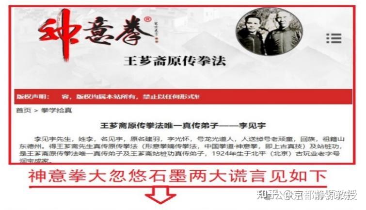 李见宇师傅是如何走进老先生门下的?这个问题李见宇师傅生前和我说过了N多遍。这是他走进意拳门的开始,难免要比祥林嫂还能得逼得、得逼得的喋喋不休。本来,我以为这样本门派最基础的知识,早就尽人皆知了,不值得我再考辨了。然而,当我看到那个神意拳大忽悠石墨在个人网站的介绍,我还是被震惊到了!请看该网站截图: