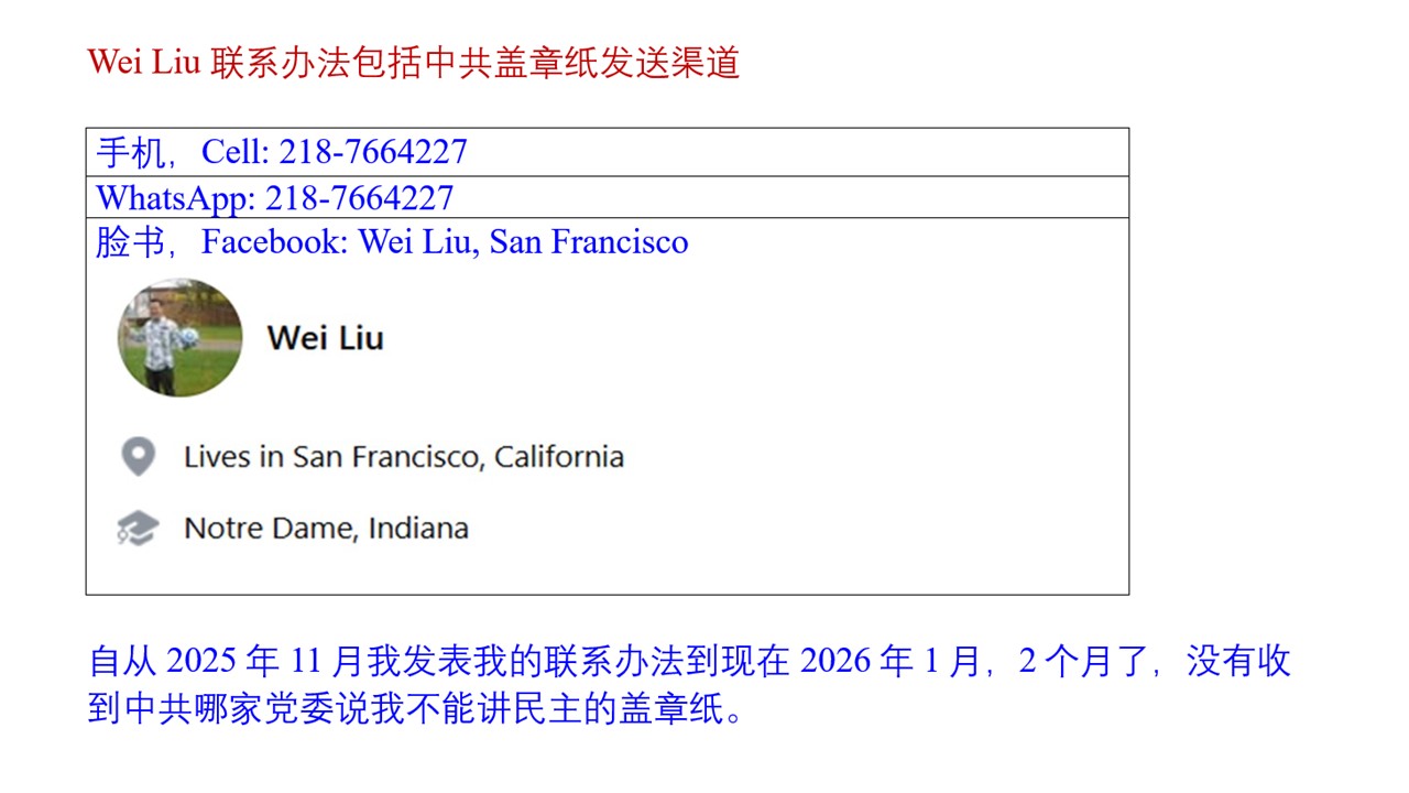 我从2000年代开始讲民主,2020年代是我讲民主的第三个十年了。至今没有中共盖章纸说我不能讲民主。我接收各界人士信息的渠道有三个:我的手机01-2187664227,WhatsApp: 01-2187664227, Facebook,脸书:Wei Liu, San Francisco, 有足球的男士。自从我2025年11月发表了我手机等联系办法,到现在2026年1月,2个月了,没有收到中共任何党委的盖章纸说我不能讲民主。