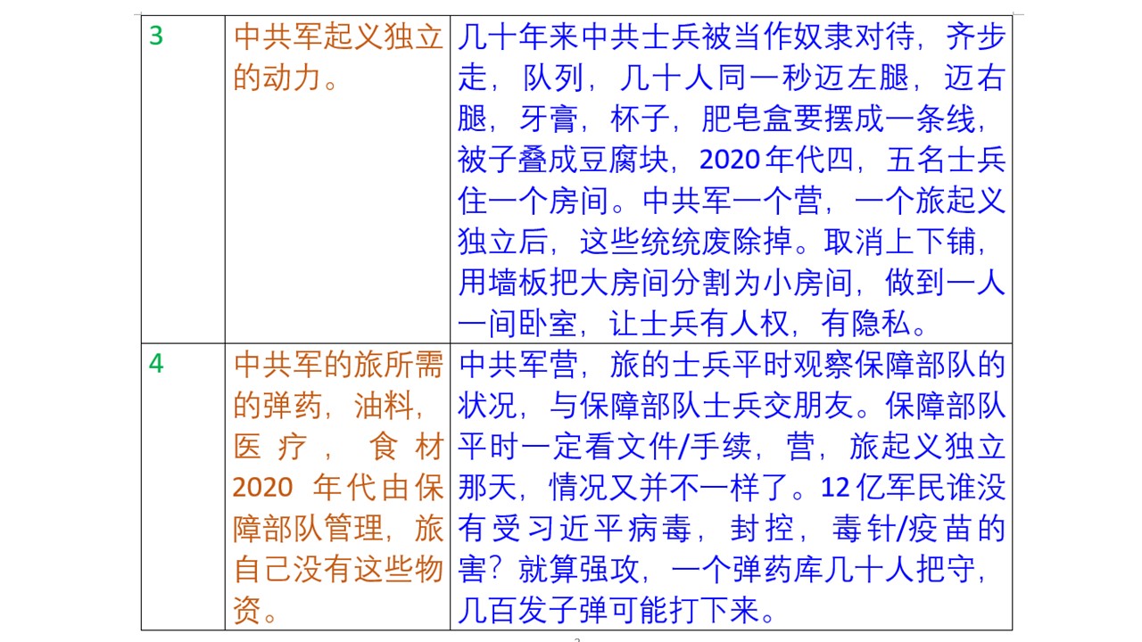 中共军起义独立探讨三:中共军起义独立的动力:士兵不再是奴隶。中共军实行奴化管理,不给士兵自由,隐私。实行一系列折磨人的制度,包括杯子,牙膏,肥皂盒等要拍成一条线,被子要叠成豆腐块,等内务管理。士兵怎么走路都管,包括齐步走,队列训练,一个连所有必须在同一秒迈左腿,同一秒迈右腿。士兵去哪里都要向班长报告。士兵四人,五人住一个房间,床除了晚上睡觉,白天不能坐,不能躺。手机随时被查看,收走。下午5点后,中共军还必须看晚上7点的《新闻联播》,还有晚上9点的晚点名。传说中的奴隶制也没有这么残酷。中共军起义独立后,无论是多少人,都废除掉这些侵犯人权的制度,杯子,牙膏,手机本来就是私人物品,长官无权过问。士兵住宿上下铺取消,可以用墙板,分割大房间,安门,安锁,不是高科技,做到士兵一人一间卧室。军人与其它行业一样,有人权,有隐私,有纪律。作息时间上午6点半出操,下午5点下班。晚上值班的就是白天休息。