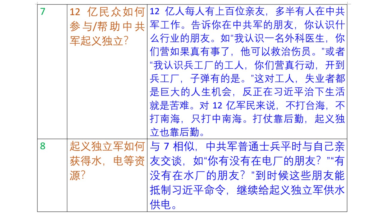 中共军起义独立探讨七:12亿民众如何参加/帮助中共军起义独立。武器面前人人平等。不要再想着中共的官阶了。中共环境的农人,工人,失业人,家庭主妇完全可以发挥巨大的作用。现在人人都有手机,理论上中共环境任何人可以与12亿人中任何人联系。每个人都有上百位亲友。我们建议每位军民交两位信得过的朋友,算上自己就是三个人。三个收集有关本县起义的信息。比如本周我想认识一位开火车的朋友,未必要直接谈,因为习近平有庞大的监控体系,只有我的亲友说他认识一位开火车的朋友,到时候用得着,就够了。希望12亿人每人能告诉你中共军亲友与起义独立有关的信息。如一位城市人可以告诉其在中共军的亲友,“我认识医院的一位外科医生,如果真正需要的时候,他可以救治伤员。”打仗靠后勤,起义独立也靠后勤。