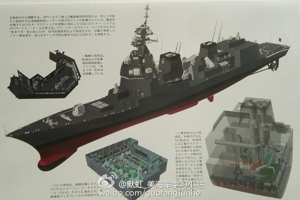 "此外,27DDG 型驱逐舰还会配备诺斯罗普·格鲁曼公司研制的AN/SPQ-9B型雷达,该型雷达也被安装在澳大利亚海军的“霍巴特”级驱逐舰之上。27DDG型驱逐舰将采用全新的反舰配搭,动力为COGLAG配置,这也是日本的战舰首次采用这种动力配置。"