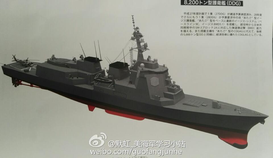 "近日,日本抛出最新型的27DDG型驱逐舰,该型驱逐舰最早将于今年开工。这种驱逐舰比“爱宕”级驱逐舰满载排水量还要大500吨,常备排水量将达到10070吨。"