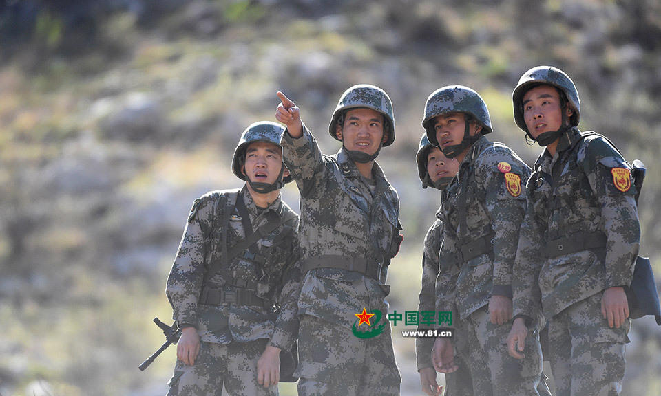 "担负教学示范任务的战士(左2)为即将开始实弹射击的学员介绍情况。"