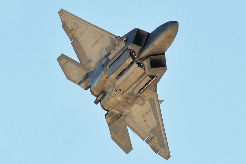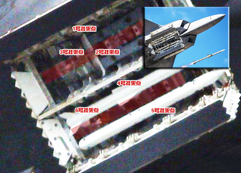 F-22战斗机的弹舱内可挂载6枚AIM-120C8导弹,请注意其导弹是按照位置错层挂载的,为“一前两后”排列,这与歼-20的挂架点不同,但两者都可携带6枚中距空空导弹。