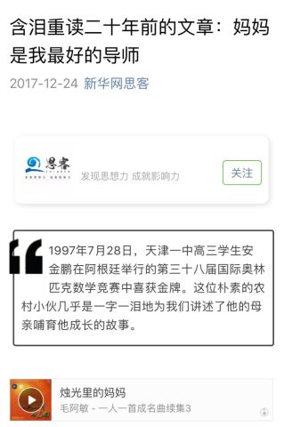 2017年末,新华网思客(新华每日电讯官方微信)转载了10余年前天津日报刊发的一篇杜撰安金鹏故事的文章,并配发毛阿敏一曲《烛光里的妈妈》,引发众多读者含泪热评。编者当时第一次读到这篇文章,几乎是含着热泪立刻开始了寻人,并很快联系上了安金鹏老师本人,不意间揭开了这一幕荒诞剧。