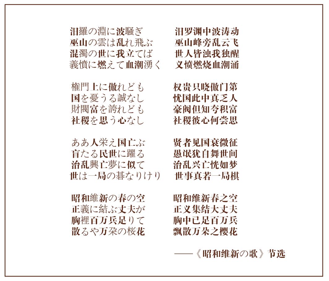 或许正得益于此,日本海军中尉三上卓才能有足够的才气,在 1930 年写出一曲《昭和维新之歌》(词曲均由其创作),激励着一辈辈的昭和男儿们前仆后继。