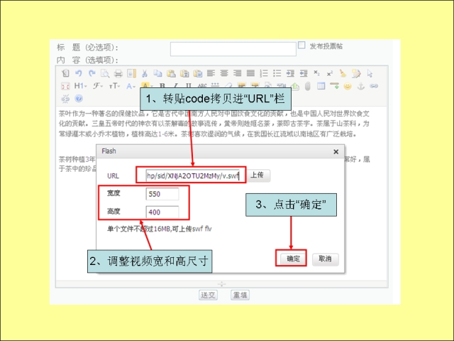 2、优酷 2.1、拷贝视频所在网站提供的转贴code: 在优酷的视频下面,点击转贴处的箭头(图1),在“把视频贴到Blog或BBS”下的三项里任选其一点击所选项右边的“复制”(图2),出现拷贝成功的提示后点击“ok“(图3): 图1: