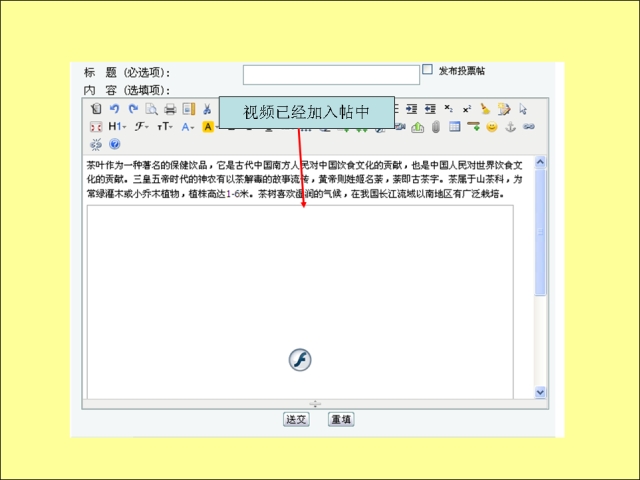 2.2.2、选择的转贴code是flash地址: 帖子的内容栏先点击“Flash”键(图6),用发帖栏提供的嵌入flash功能键加入视频(图7)。 图6