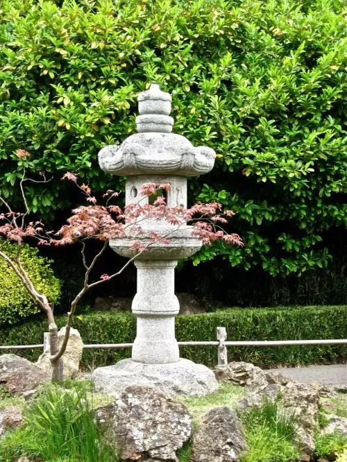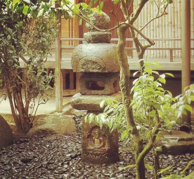 石灯笼的源头据说是来自佛教的献灯,其形状有三角形、四角形、六角形、八角形和圆形,因其具有照明和可以添景的双重功能,所以首先在茶庭中被使用。在茶庭中,水也是必不可少的元素,因为水是从尘世到圣界,从现实向非现实转化的媒介,所以作为能够清洗身体和内心罪恶的象征物。