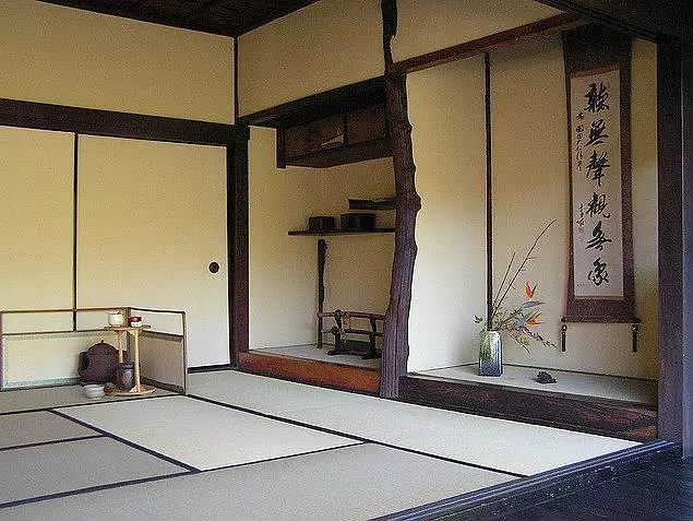 日本第一个独立茶室创始人千宗易(又名利休)追求的就是无上的孤寂,他主张露底的修建要“放眼皆寥寂,无花亦无枫,秋深海岸边,孤庐立暮光。”在装饰方面力求简洁,以及不对称的美学原理,旨在用物质的极度精简来反衬内心精神的富饶强大,避免重复。比如,茶室里只能摆放一两件必要的美感装饰品,装饰品的设置要符合茶室的主题。如果用了圆形的茶杯,那么茶壶就不应该再是圆形的;如果有了一瓶鲜花,那就不该再挂一幅以花为主题的绘画;如果用了白色茶碗,那茶罐就应该是别的颜色……