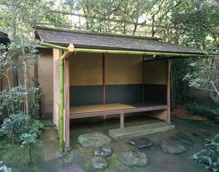 日本的茶室由茶室本身、水屋、门廊、甬道(连接门廊和茶道)组成。一般日本的茶室本身面积都不大,五六平方米。据说日本茶室的面积是由15世纪的日本茶道大师绍鸥确定的。他受佛教经书《维摩经》里面的经文启发——维摩在一间五六平方米的屋子里会见文殊菩萨和八万四千个佛家子弟。这个寓言表达了一种佛教观点,即对于真正觉悟的人来说,空间是不存在的。