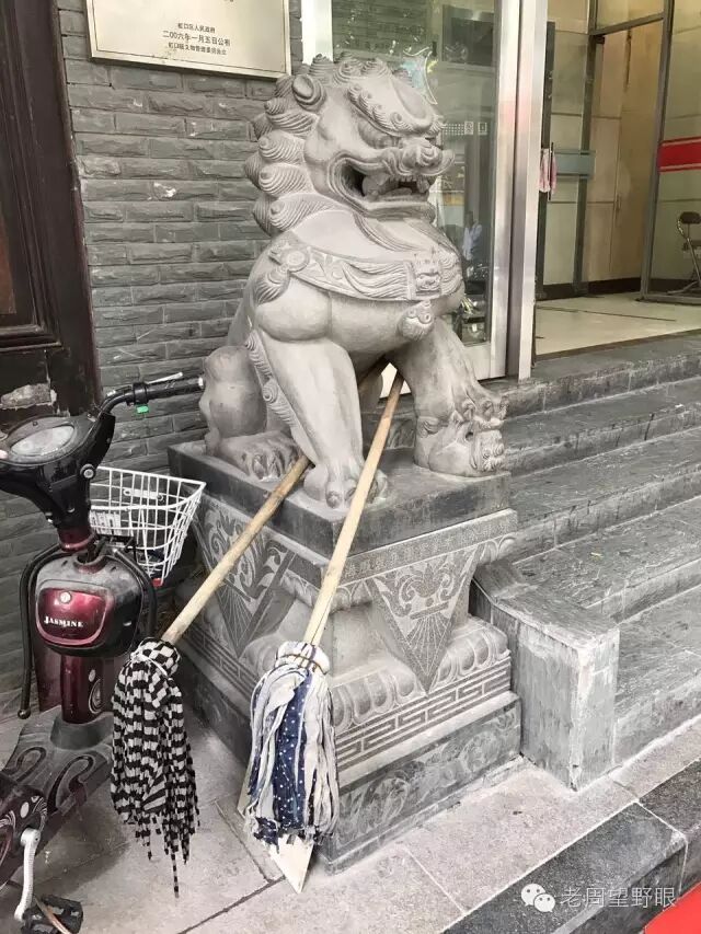 公啡咖啡馆门口有一对石狮子,永远晾着几只拖把