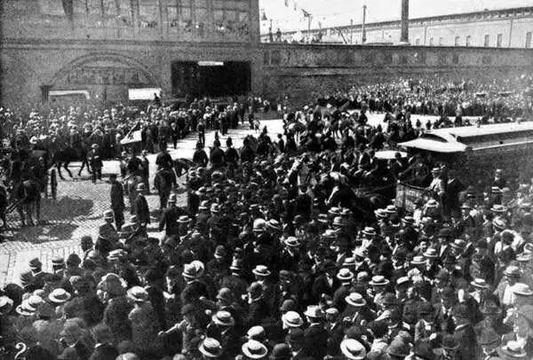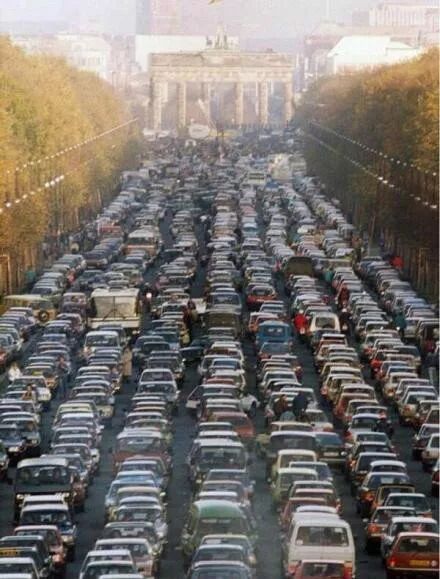 1989年11月,柏林墙被推倒之后,人们从东柏林涌住西柏林的情景。