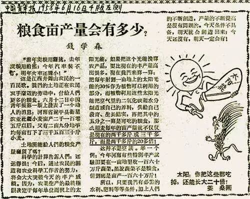 大跃进时,中科院农学家种了6亩小麦试验田,深翻10尺,每亩下种260斤到400斤,施粪肥40万到60万斤,白天用鼓风机吹,以增加二氧化碳,晚上用灯光照,以增加光合作用。结果,最好的一块地亩产也只有900斤。