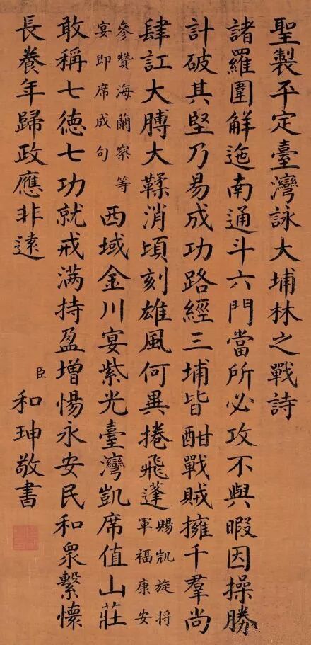 和珅的书法,故宫有收藏,其书法融欧、颜、柳于一体,颇具书卷气,可知当年是用过功的。任何手段、任何资料,都难以记录、反映历史人物的原貌和全貌,民间有“和珅跌倒,嘉庆吃饱”之说,我们由此知道和珅是巨贪。