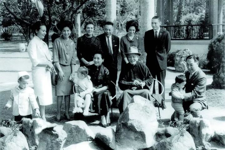 60年代,蒋氏家族在士林官邸的林园春游,留下这张全家福照片。蒋介石与宋美龄端坐中间,右边蹲着抱着孩子的为蒋纬国,后排右起为蒋经国的长公子蒋孝文、蒋孝文的妻子徐乃锦、蒋经国、蒋方良、蒋纬国的夫人丘爱伦、蒋经国的女儿蒋孝章。士林官邸位于台北阳明山下。