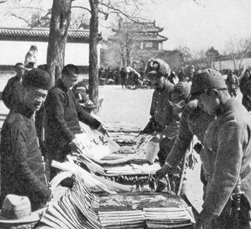 1938年3月1日,日军占领山东曲阜,在孔子庙前观看中国印刷品的日本兵。日军对孔子十分敬重,不允许下级士兵到孔府孔庙骚扰。直到1945年8月日军投降为止,曲阜“三孔”在日军占领时期没有受到任何破坏。对于孟子庙,日军也采取了保护措施。