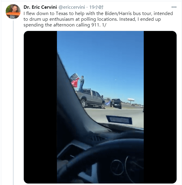历史学家埃里克·塞维尼(Eric Cervini)博士当时正开车去帮助拜登竞选站台,他拍摄到高速公路上有一排皮卡,其中很多都挂着川普的旗帜。这些司机“在拜登-哈里斯竞选大巴从圣安东尼奥前往奥斯汀时,等待伏击”,塞维尼在推特上写道。