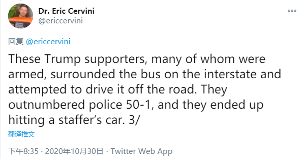 他的推文称:“这些川普的支持者,其中许多人都带着武器,在州际公路上包围了大巴,并试图将其赶出公路。他们的人数比警察多,50比1,最后还撞上了一名工作人员的车。”