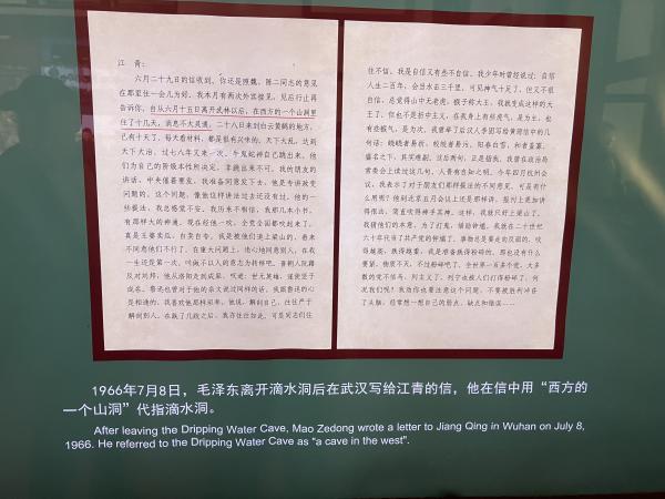 本文附带一封毛泽东于同年7月8日在武汉寄给江青的信。该信里,毛泽东表达了其内心严重的不安,被逼上梁山,上“贼船”。当时的中国发生了毛泽东不愿意看到的事,文革,他当然会内心不安。该信展示在韶山滴水洞宾馆的展厅里。
