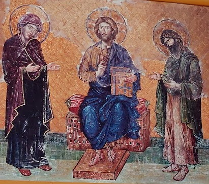 这是最感人的一幅图:耶稣居中,神情慈悲,圣母玛利亚和施洗约翰在两侧为世人代求。那表情中有温柔、有哀伤、有庄严,仿佛可以穿透人心。