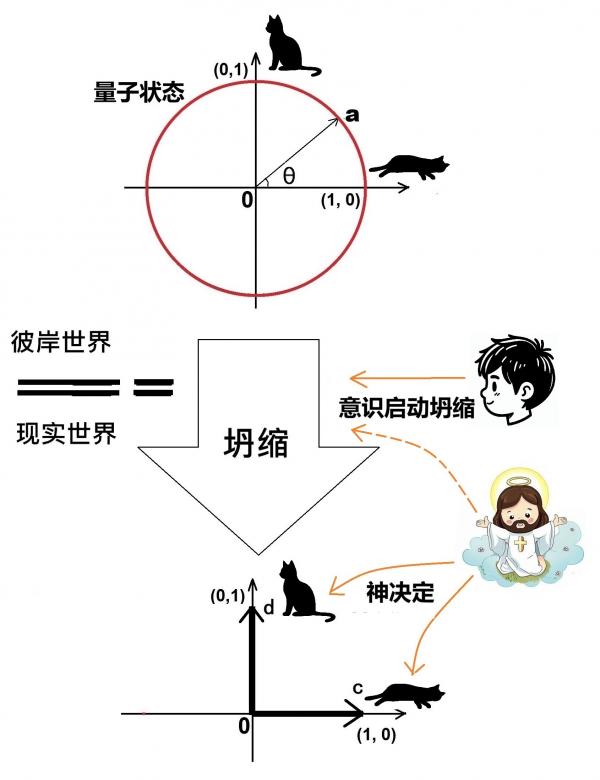 图13. 为填补科学留下的逻辑漏洞,推测人与神在坍缩中的作用。其中人或神的意识启动坍缩,神单独决定每次坍缩结果。如此解释符合逻辑,尤其逻辑公理PSR。