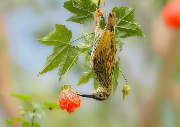 它倒挂在枝头,双爪紧握着那一根细藤,身体向下,喙轻触花心。