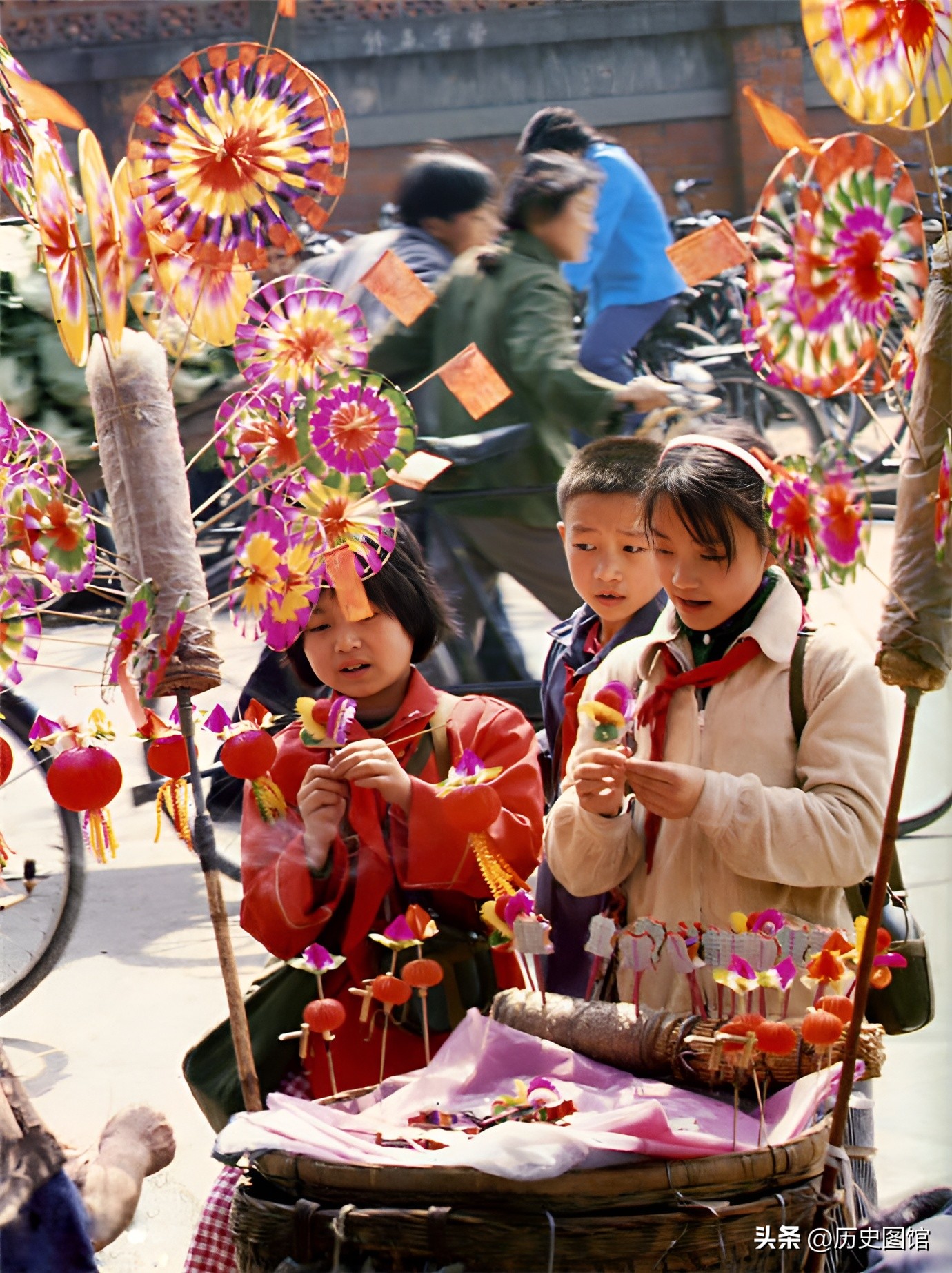 80年代,街头的玩具摊前,几个放学的小学生在挑选玩具。漂亮的风车旋转不停,连空气里都浮动着闲适的节奏。