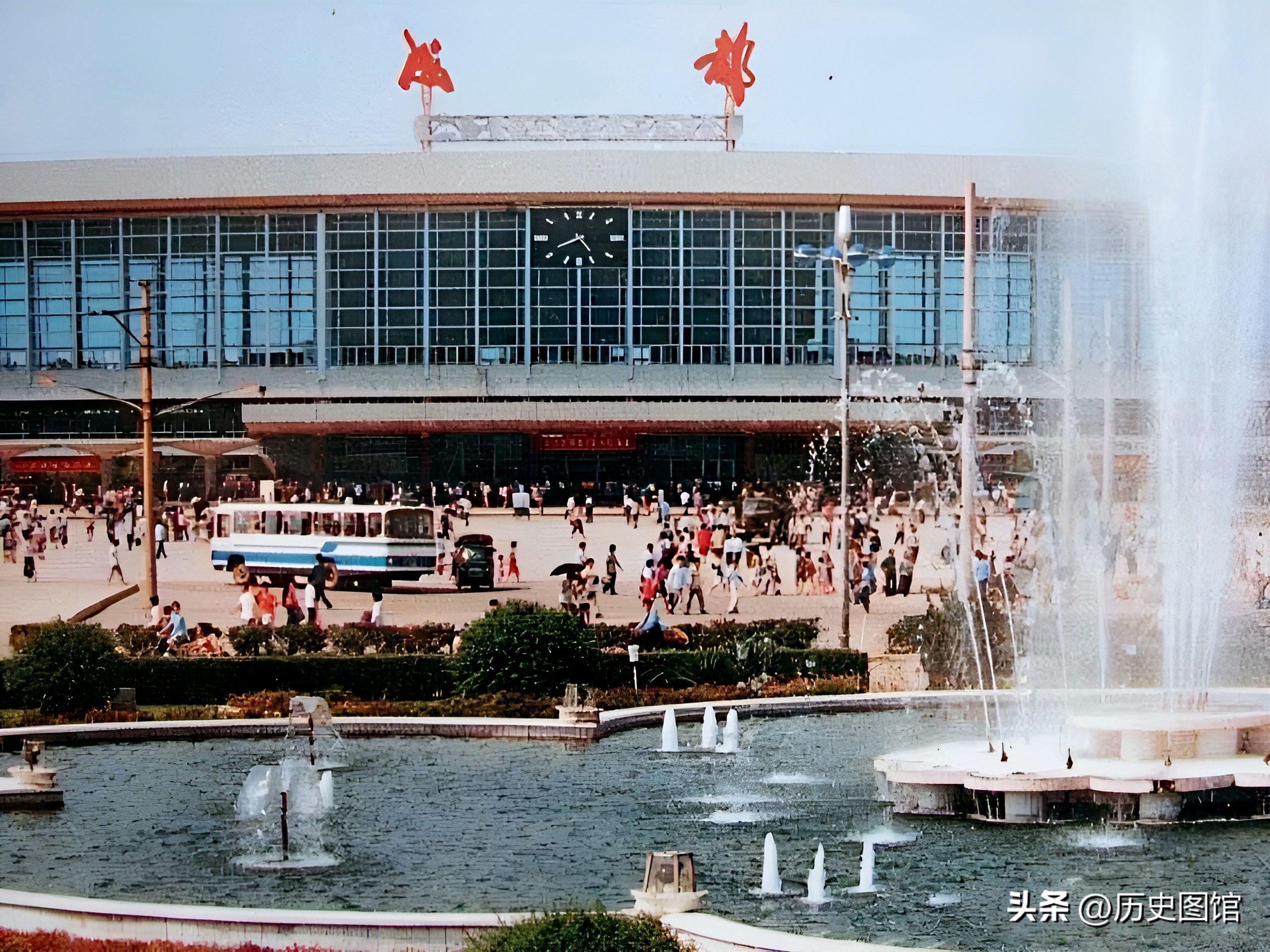 这是80年代成都火车站,站房顶上“成都”二字十分醒目。站前广场上,有数不清的游客。近处是一个巨大的喷水池。