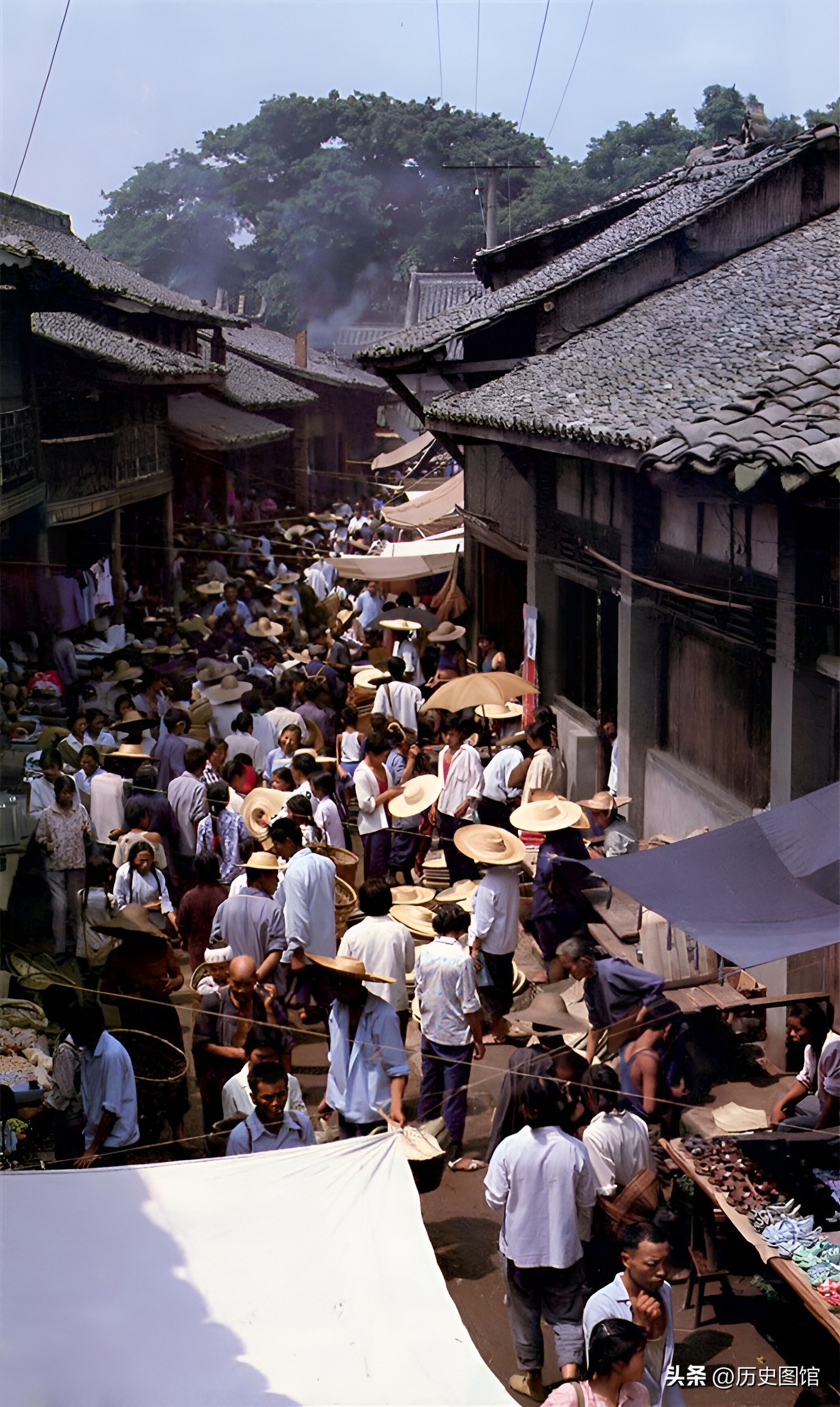 80年代,成都椒子街市场,沿街店铺都在开门营业,很热闹。
