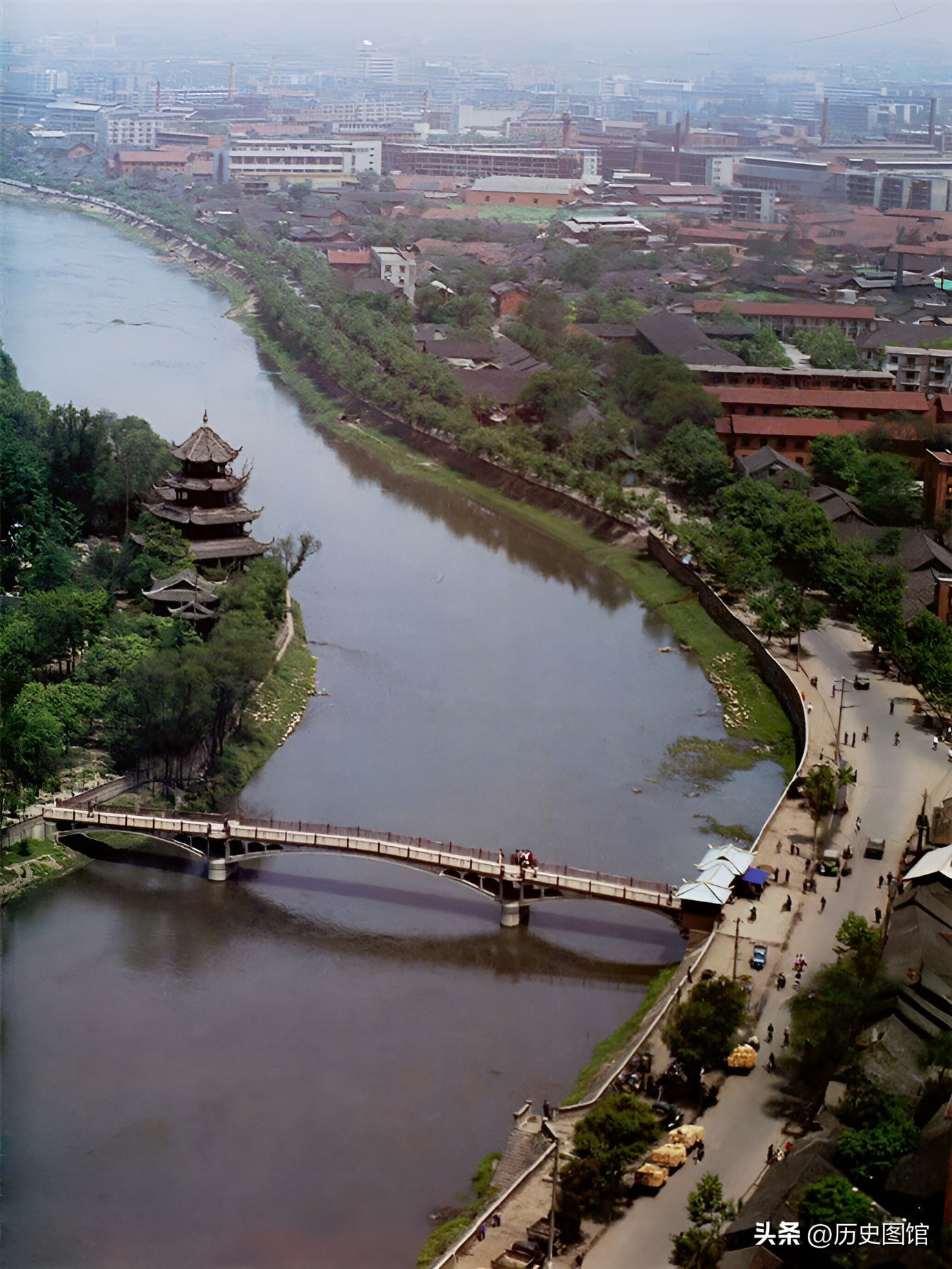 1984年,从空中俯瞰锦江。江边那座古色古香的楼阁是望江楼。当时,望江楼附近有一座大桥。