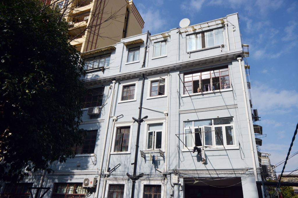 确实,房屋建成到今年已经九十五年了,居民也不知换了多少茬,更不知道哪年又曾加建过一层,然而钢筋混凝土框架结构的身骨却依然硬朗。现建筑占地面积620平方米,高四层,建筑面积1391平方米。据外立面四楼窗户的形制与下面几层明显不同判断,第四层为后来加建的。不过楼内可见敦实的水泥方柱和梯形柱帽足以承重得了加建的楼层。建筑平面略呈长方形,具有不对称的平面和不对称的立面,边上还有条小夹弄作为进出后面辅楼的孔道,因而很难界定它究竟属于哪种建筑风格。南立面一楼门框和二楼窗框上方有横向的齿形线脚,三层挑檐下有水泥浇筑的椽形饰块,外墙面上有模仿石块砌筑的线条和方壁柱,这些是属于西方传统的古典装饰,然而矩形窗框用水泥型塑出来的线条及几何形图案又有点像现代的装饰艺术。网上看到有人把它归类于现代派建筑,可能仅是指它的不对称和采用大尺度钢窗而言,但我觉得这两条特征并不明显。反映在这栋房屋上的建筑师原创设计很少,我高度怀疑它的原型来自伦敦或者纽约,是一种居住形式和生活习惯的拷贝,以今天的眼光来看,建筑的历史价值和文化价值也刚好体现在这一点上。徐汇区文化局慧眼识珠,2017年4月27日,公布它为徐汇区的文物保护点。