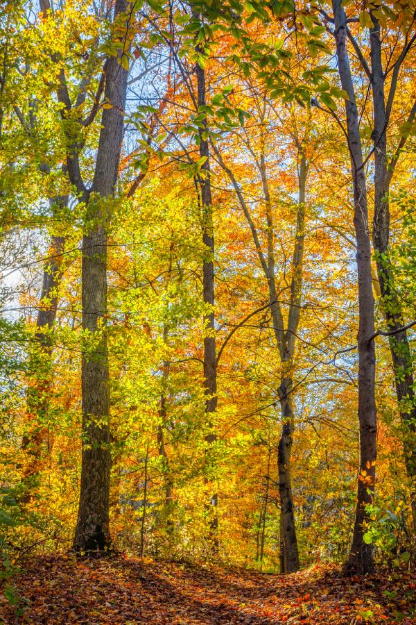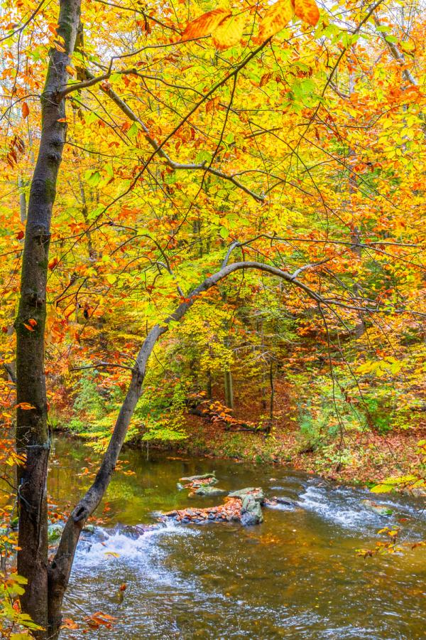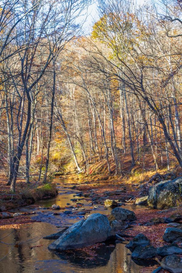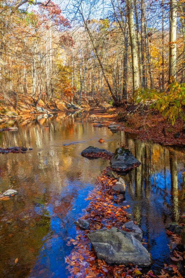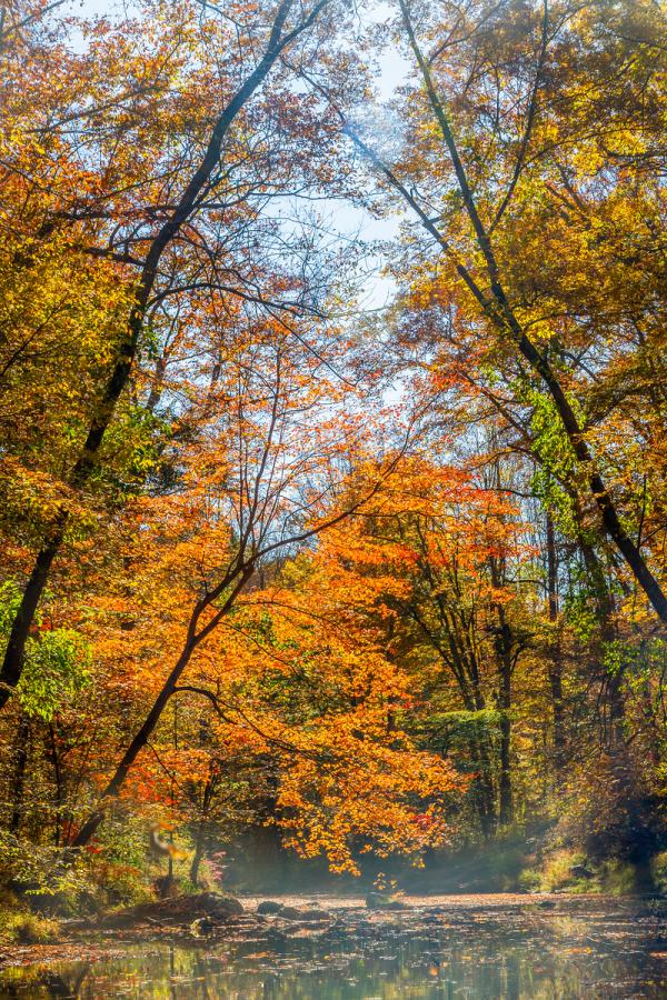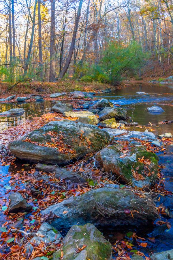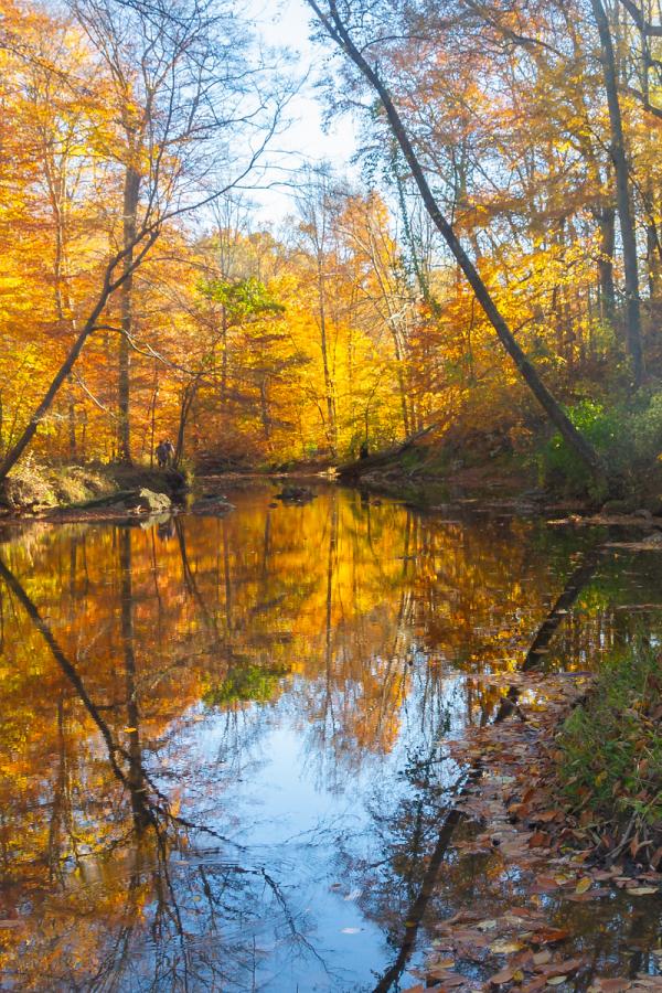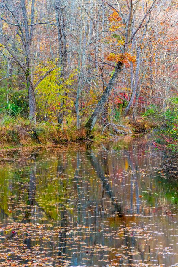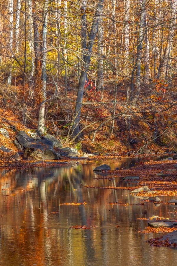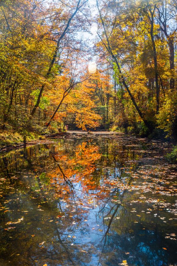 宾州雷德利克里克公园,树影交错,光斑点缀;水面含情,落叶成诗