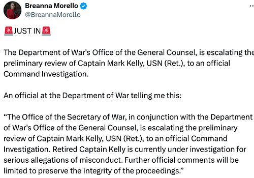 一位战争部官员告诉独立记者布里安娜·莫雷洛:“战争部长办公室与战争部总法律顾问办公室一起,正在将对马克·凯利上校(退役)的初步审查升级为正式的指挥官调查。”“退休的凯利上校目前正因严重的不当行为指控而接受调查。