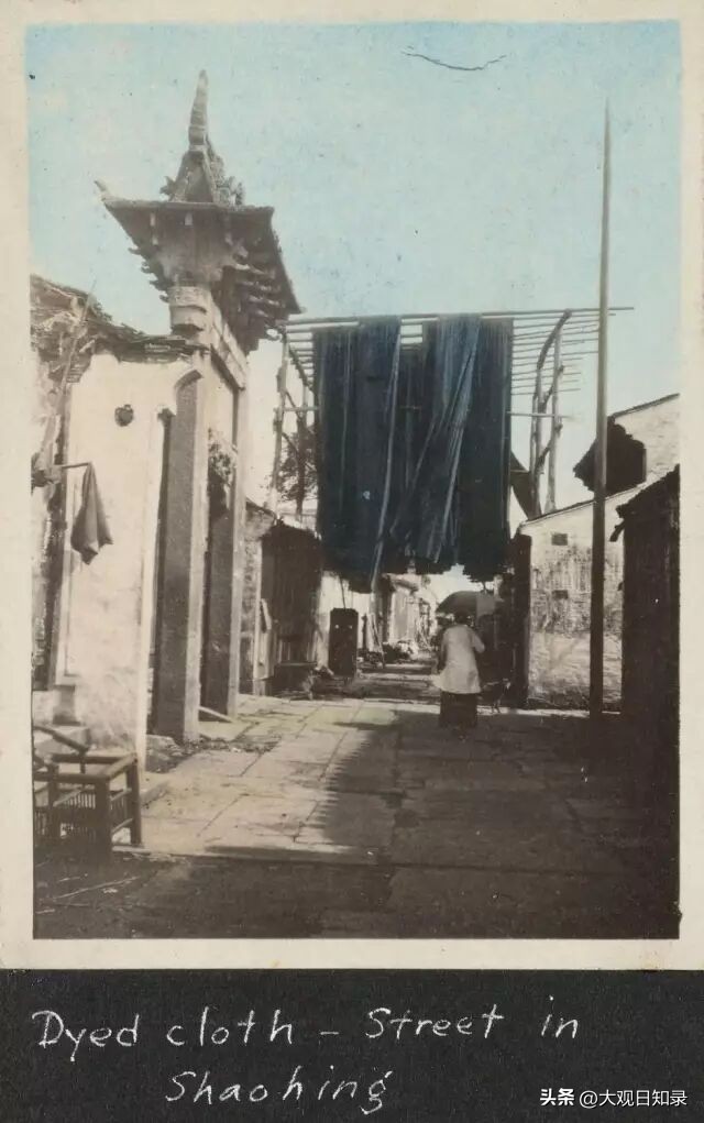 绍兴的街道,有一座牌坊,附近还有染坊,挂着染布。