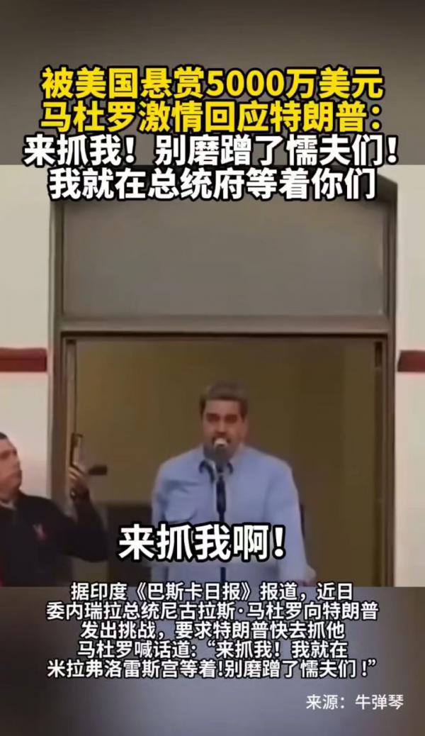 一切全都按我们老祖宗所预言的发生。川普刚刚发布了一段视频:马杜罗曾公然向他挑衅,叫嚣“有种就来抓我”,川普回应:“挑战接受。”单挑也离不开马——单枪匹马。