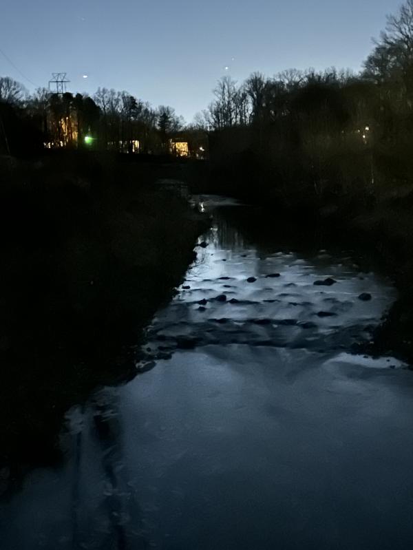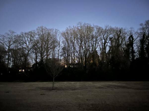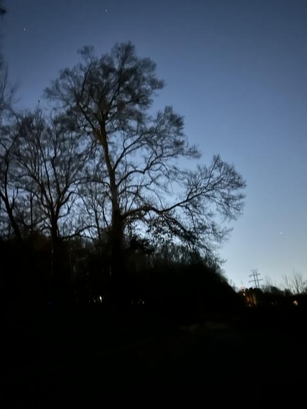 日落后,小糖溪绿道越来越暗,不见一人,大草坪上,三只野鹿见我来了,走远。一只站在大树下与我对视。透过光秃秃的大小树干,几家灯火微明,红意点点发圆,有人在灯下凝望吗?