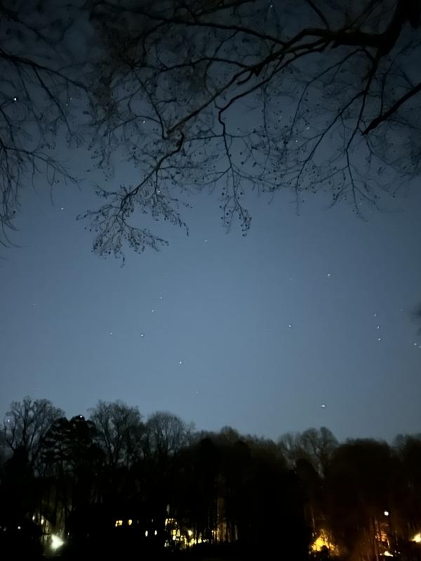 几天来的喧嚣渐渐褪去,冬日夜晚,连虫儿都不肯低鸣,星星,渐渐出现在夜空上,依旧沉默。几个飞机移动,机头红光,机尾白光,不停地闪。暗蓝色,抹去了溪水的波痕。