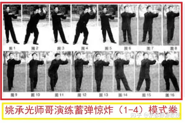 好就好在:祖师爷把完整的筋骨桩和56模式拳的练习动作都传授给了姚宗勋师伯和我师傅李见宇。而姚宗勋师伯对此做了彻底的改进和精炼——姚宗勋师伯将全部56模式拳拆分成向前发力、向上发力、向下发力、向左发力、向右发力、单手发力、双手发力、旋转发力、向后发力等等,他把56模式拳按照现代武学技术加以修改和精炼,的确更实用了。这是姚宗勋师伯的伟大所在。比如,第22模式拳是蓄弹惊炸,就是中意武馆和宗勋武馆教学中的前发力。请见姚承光师哥演练的前发力全部动作截图1-16,其中1-4即为蓄弹惊炸动作的绝大部分。只是起始动作略不一样之外,图1-4就是第22模式拳蓄弹惊炸的核心动作。
