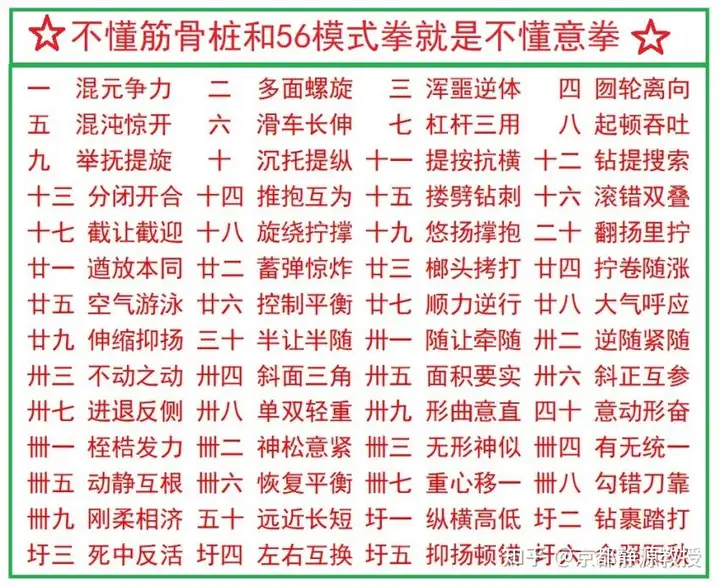 我学习意拳,只想继承传统。比如说,《大成拳论》、《意拳正轨》、《意拳谱》中记载的很多动作和桩法,现在还有几个人会?你们看看下面这56个模式拳,今天的意拳家究竟能做到几个?