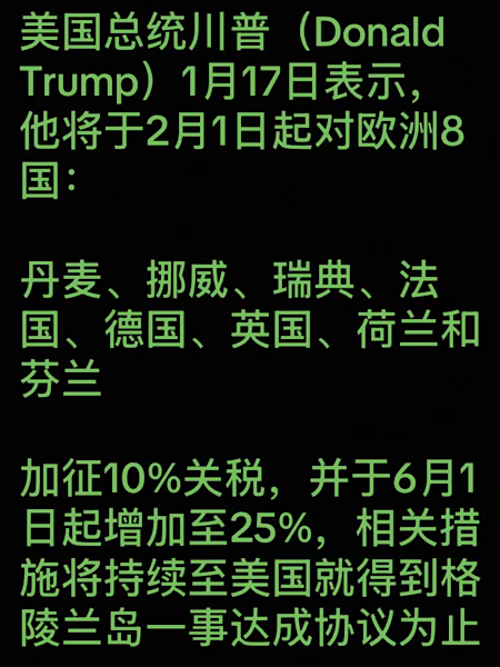 从2026年2月1日起,上述所有国家(丹麦、挪威、瑞典、法国、德国、英国、荷兰和芬兰)将对运往美利坚合众国的任何和所有货物收取10%的关税。