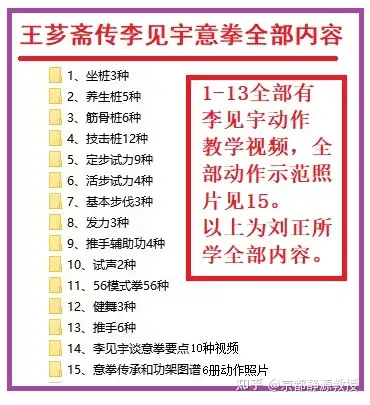 很多人来信问我向李见宇师傅所学的意拳全部内容,我将所学目录公布如下,见下图: